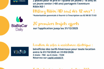 Du transport à la demande, kézako ? Trois principes à retenir : j’appelle, je réserve, je voyage… ça y est, vous avez tout compris ! À partir du 24 février 2025, nous vous proposerons ce nouveau service, Ribin’AD, un véhicule de 8 à 37 places qui vous prend en charge sur des arrêts définis, à des jours et horaires définis, pour vous conduire à Landerneau ou Daoulas, selon votre commune de départ. Parce qu’on s’engage toujours un peu plus en faveur d’une mobilité durable et inclusive.Pensez à réserver votre trajet dès à présent !
